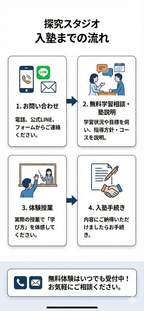 探究スタジオの雰囲気や指導方法、お子様との相性を確かめていただくために、無料体験は随時受け付けています。